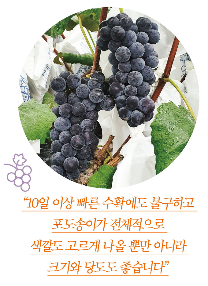 김형윤 농부는 “위드크롭스㈜의 재배력에 따라 포도 생육 시기별 ‘타마락’, ‘워코짐사이즈업’, ‘크릴오가닉’, ‘워코짐칼라’ 등 체계적인 영양공급 을 통해 10일 이상 빠른 수확이 가능했다”며 “빠른 수확에도 불구하고 포도송이가 전체적으로 색깔도 고르게 나올 뿐만 아니라 크기와 당도도 좋다”고 말했다. 이어 “특히 올해와 같이 날씨가 안좋은 조건에서도 예전과 다름없는 고품질의 포도를 수확하고 있다”고 강조했다.