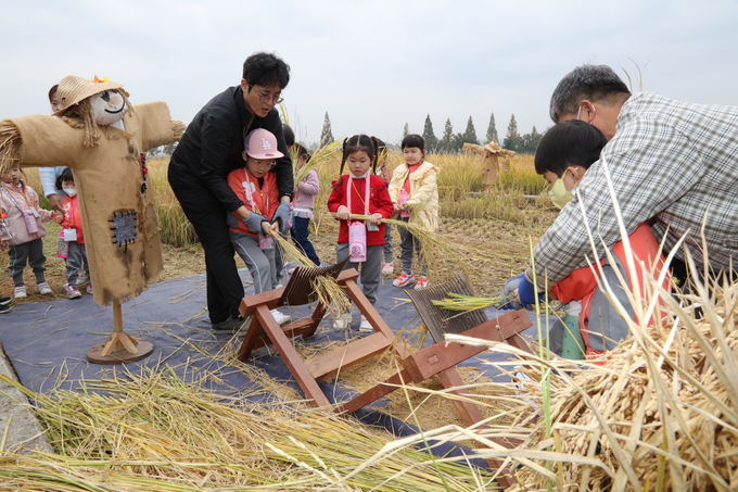 어린이 벼 베기 및 탈곡 체험 행사가 24일 경기도 수원시 농촌진흥청 국립식량과학원 중부작물부에서 열린 가운데 행사에 참여한 어린이들이 선생님과 함께 벼 베기와 나락 탈곡 홀태 체험을 하고 있다. 이 행사는 농업의 가치와 우리 쌀의 소중함을 알리기 위해 마련됐다.