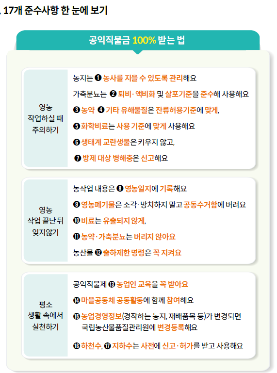 필수안내서는 농업인이 직불금을 100% 수령할 수 있도록 의무준수사항을 일목요연하게 정리하였으며, 사진 등을 활용하여 고령 농업인의 가독성을 높이는 등 영농과정에서 용이하게 활용될 수 있도록 제작되었다.