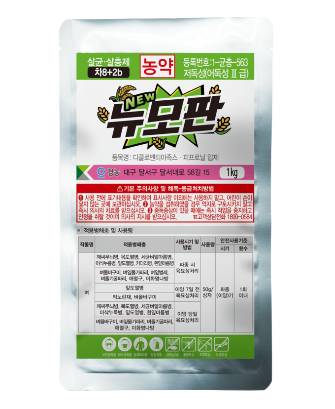 이번에 ㈜경농에서 출시한 ‘영순위’와 ‘뉴모판’ 입제는 국내 최초로 등록된 ‘디클로벤티아족스’를 함유한 육묘상자처리제이다. 두 제품 모두 파종동시 처리는 물론 이앙동시 처리가 가능한 3세대 제품으로 경영비 절감은 물론 생력화와 고품질 벼 생산에 도움을 준다. 기존에 사용하고 있는 제품과 다른 새로운 성분으로 저항성이 없어 수도 본답 초기에 발생하는 문제 병해충에 대해 안정적인 약효를 나타낸다.