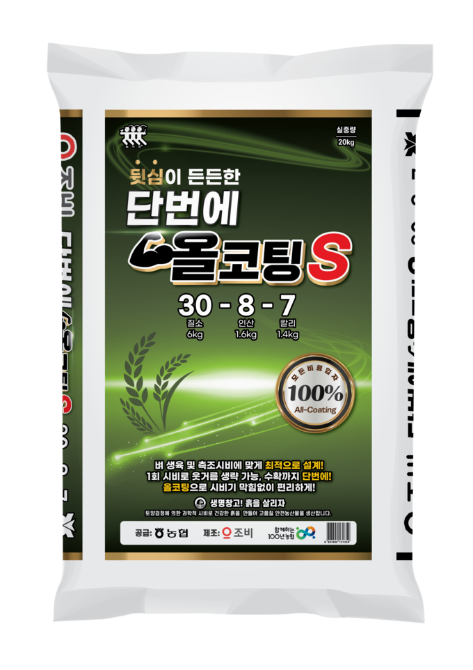 ‘단번에올코팅’은 비료의 3요소인 질소, 인산, 칼리가 모두 100% 올코팅된 비료라는 점이 특징이다. 이들 3가지 핵심 유효성분이 작물의 생육주기에 맞춰 적절히 용출되면서 시기별로 최적의 양분을 공급해 벼의 건강한 생육을 돕는다. 이는 곧 도복 경감 및 수량 안정화 등을 통해 품질 향상을 이끈다.
