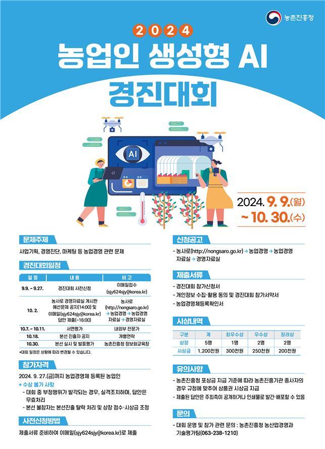 농촌진흥청(청장 권재한)은 오는 10월 30일 개최되는 ‘2024 농업인 생성형 인공지능(AI) 경진대회’ 본선을 앞두고 9월 9일부터 27일까지 예선 참가 신청을 받는다.