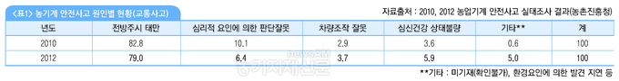 농기계 안전사고 원인을 살펴보면 전방주시태만 79%, 심리적 요인에 의한 판단잘못이 6.4%, 건강상태불량이 5.9%, 차량조작 잘못이 3.7% 순으로 나타났다.