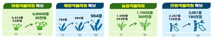 3대 추진전략은 △재래종, 희귀종 등 현재 보유 중인 8,073종을 2030년까지 9,700여 종 이상으로 확대 수집 △경제‧생태적 가치가 높은 1,135종 토종식물을 선정하고 유전체 빅데이터를 대량 구축해 맞춤형 유전체 정보제공 △식물 분야 빅데이터 활용 전문인력 양성과 연구‧산업 현장 지원 등이다.