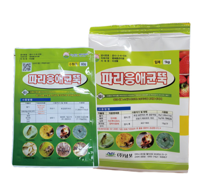 한편, ‘파리응애균뚝’은 2021년에 출시된 최초의 살균살충 동시등록자재로 농가들이 가장 피해를 많이 입는 작은뿌리파리, 고자리파리 등의 파리류와 응애 및 탄저병, 흑색썩음 균핵병에 맞춰 개발된 자재이다. 특히 입제와 수화제 형태로 되어 있어서 농가들이 사용이 편리하다는 장점이 있다.