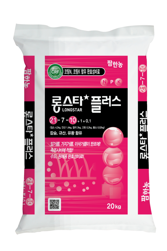‘롱스타플러스’는 질소와 칼리를 모두 코팅한 2세대 완효성 비료의 대표 제품으로, 직파 또는 이앙 시 한 번만 살포하면 벼 생육 후기까지 양분을 공급해 웃거름을 생략할 수 있다. 쌀의 품질과 등숙률 향상에 도움이 되며, 규산 · 석회 · 유황을 함유해 생리장해를 줄여준다.