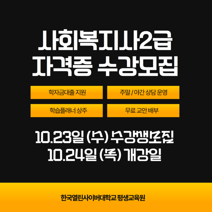 한국열린사이버대학교 평생교육원이 다가오는 23일 수요일까지 사회복지사2급 수강생을 모집한다고 소식을 전해왔다. 이번 과정은 2학기 6차로 24일 목요일 온라인으로 개강한다.