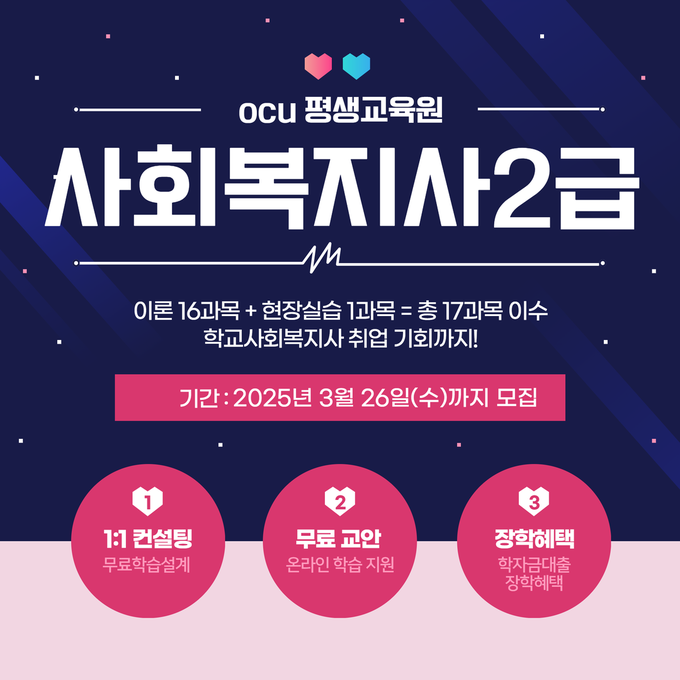 한국열린사이버대학교 평생교육원이 사회복지사2급 자격증 취득을 희망하는 이들을 위해 특별 혜택이 담긴 교육과정을 제공한다. 수강생 모집 기간은 3월 26일까지이며 개강일은 3월 27일이다. 특히 이번 과정에서는 학교 사회복지사를 꿈꾸는 이들을 위한 특화 과목이 새롭게 개설되어, 실무 역량을 강화하고 전문성을 높일 수 있도록 했다.