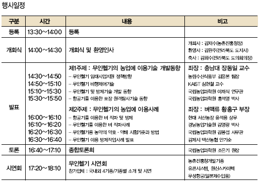 전북도청 대회의실에서 열리는 심포지엄은 1주제 ‘무인헬기의 농업에 이용기술 개발동향’과 2주제 ‘무인헬기의 농업에 이용사례’로 나눠 진행된다. 시연회는 전주시 칠정마을에 열리고 농진청 개발기종과 유콘시스템, 원신스카이텍, 무성항공(일본수입품) 등이 참가한다.