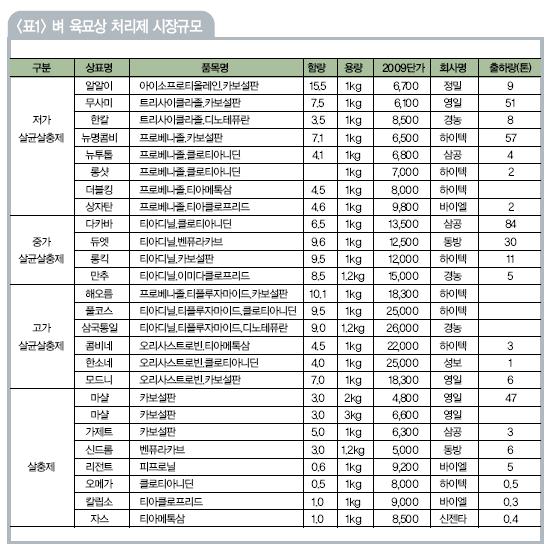 일손은 줄이고 병해충 예방효과는 높일 수 있는 생력화제형의 ‘점보제’나 ‘UG’의 매출신장도 같은 맥락으로 볼 수 있다. 육묘상 처리제의 경우 지난 2005년만 하더라도 연간 매출 규모가 200억원대였으나 지난해 350억원대 규모로 시장규모가 급신장한데 이어 올해에도 전년대비 최소한 15% 이상 늘어난 것으로 잠정 집계되고 있다. 특히 올해 육묘상 처리제 시장을 주도했던 품목과 그 특징을 살펴보면<표1>, 가격은 적당(중가,中價)하면서도 살충효과에 흰잎마름병․도열병․세균성 벼알마름병 등의 살균효과를 발휘하는 ‘티아디닐’을 유효성분으로 하는 한국삼공의 ‘다카바’와 동방아그로의 ‘듀엣’을 꼽을 수 있다. 다카바는 129만봉, 듀엣은 30만봉 이상이 출하됐으며, 생산물량이 모자라 더 이상 팔지 못한 것으로 알려지고 있다. 여기에 동부하이텍의 ‘롱킥’과 경농의 ‘만추’가 뒤를 이었다. 또한 가격이 2만원대(1만8300~2만6000원)로 비교적 고가(高價)살균살충제인 동부하이텍의 ‘해오름’과 ‘풀코스’, ‘콤비네’를 비롯 경농의 ‘삼국통일’, 성보화학의 ‘한소네’, 영일케미컬의 ‘모드니’ 등은 문고병 방제까지도 가능한 제품의 특징을 내세워 시장공략에 나섰으나 가격과 효율성 면에서 중가(中價)살균살충제에 밀리는 양상을 보였다. 그런가하면 저가(低價)살균살충제(도열병과 살충효과)로 분류되는 육묘상 처리제중 영일케미컬의 ‘무사미’와 동부하이텍의 ‘뉴명콤비’를 제외한 ‘알알이’, ‘한칼’, ‘뉴투톱’, ‘롱샷’, ‘더블킹’, ‘상자탄’ 등의 매출규모는 그다지 크지 않았다. 특히 가격이 5000~9000원대로 기존의 살충효과만을 발휘하는 저가살충제인 ‘가제트’, ‘오메가’ 등은 비록 육묘상 처리제라고 하더라도 매출부진을 면치 못했다. |