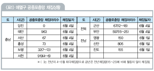 | 충남, 전북, 전남 서해안 지역에 애멸구 비상이 걸렸다. 최근 농촌진흥청 및 서해안 지역 농업기술센터에 따르면 충남, 전북, 전남 해안 10개 시·군에서 ‘벼 에이즈’로 불리는 줄무늬잎마름병을 옮기는 애멸구가 대량 채집됐다. 이들 지역은 벼 20포기당 애멸구 수가 20~40마리로 긴급방제를 필요로 하는 11마리를 크게 넘었다. 농진청의 공중포충망 채집 결과<표1> 충남 태안 963마리, 서산 65마리, 보령 32마리, 서천 919마리, 전북 군산 67마리, 부안 597마리, 전남 영광 150마리, 신안 805마리, 진도 155마리 등 지난해보다 월등히 많은 것으로 나타났다. |