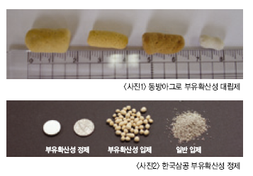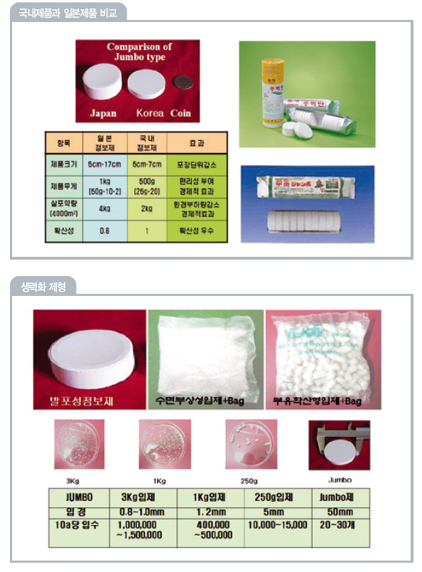 간편하고 효과좋은 농약이 대세 현재 (주)경농의‘점보제’가 생력화 제형 논잡초약 시장의 63.3%(2009년 4월말 현재)를 점유하며 계속 바람을 일으키고 있는 가운데, (주)동방아그로는 수면부유확산성을 갖는 중대형 농약입제(대립제)<사진1>를 개발해 지난 2008년 6월에 특허등록한 후 내년부터 상표명 ‘콩알탄’과 ‘던져라’(직경7mm)로 제품화할 계획에 있다. 이에 앞서 (주)동부하이텍은 국내 제조 ‘대립제’(직경5mm)인 ‘펴나네’와 ‘투척탄’을 판매중이며, 한국삼공과 성보화학(주)은 각각 ‘투망’(직경6.5mm)과 ‘퐁당퐁당’(직경5mm)을 시판 중에 있다. |
