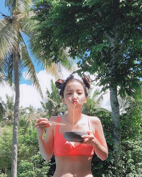공개된 사진 속 지숙은 비키니 수영복을 입고 국수를 먹고 있다.