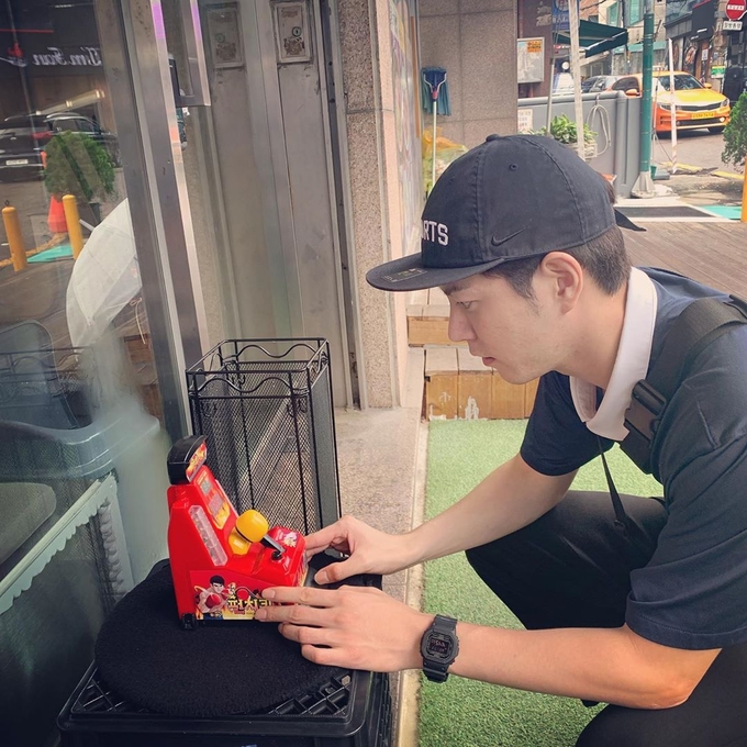 사진 속 홍종현은 한 상가 건물 앞에서 작은 손가락 펀치 기계를 보며 진지한 표정을 짓고 있다.