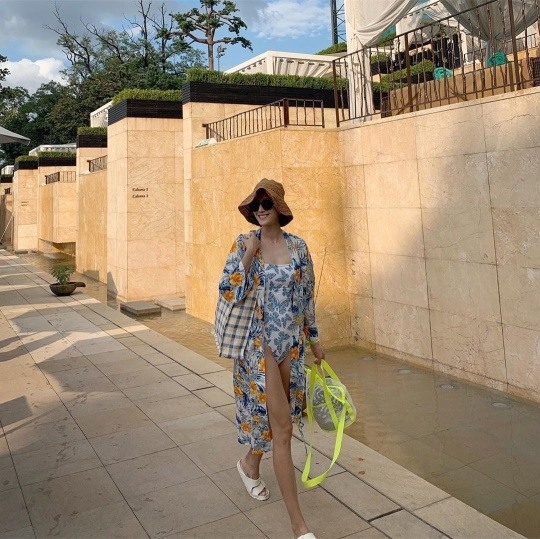 공개된 사진 속 이현이는 화려한 수영복을 입고 모자를 착용한 채 환한 미소를 짓고 있다.