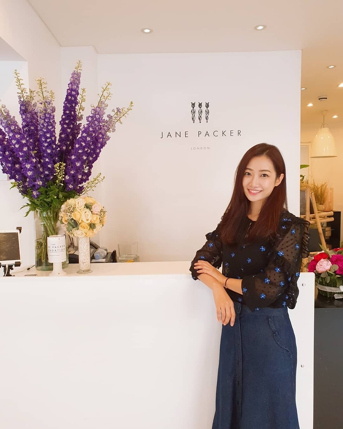 사진 속 김민정은 런던에서 꽃과 함께 활짝 웃는 모습을 보인다.