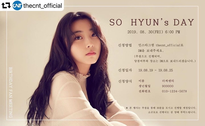지난 20일 권소현이 자신의 인스타그램에 “안녕하세요 권소현입니다~ 26번째 생일을 맞아 그동안 항상 응원해주셨던 팬분들에게 어떻게하면 조금이나마 감사한 마음을 전할 수 있을까싶어, 조촐하지만 팬분들과의 만남의 자리를 만들게 되었습니다~!! 부족하겠지만 모여서 좋은 추억 만들었으면 좋겠습니다~ 참여방법은 @thecnt_official DM 으로 양식에 맞게 보내주시면 된다고합니다~ Hello, I’m Sohyun My birthday is comin soon, I’m going to have a fan gathering to thank you all for your great support. It’s not going to be a big event but I hope to see you all and make wonderful memories with you. If you want to participate this gathering please contact us by @thecnt_official DM Once again thank you and it would be a pleasure seeing you all.”라는 글과 함께 사진을 올려 근황을 알렸다.