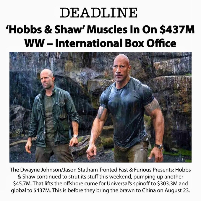 20일 드웨인 존슨은 자신의 인스타그램을 통해 “Good 2nd week of box office business. $437M worldwide. Nice momentum as we roll into China this coming weekend. Thanks everyone for supporting our lil’ spin-off known as @hobbsandshaw. @sevenbucksprod”라는 글과 함께 사진을 게재했다.