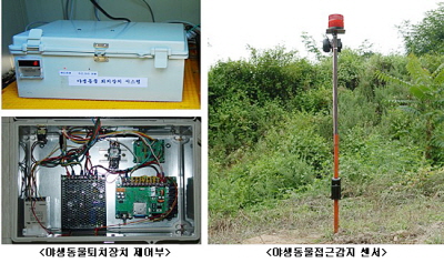 농진청 생산자동화기계과에 따르면 이 기기는 야생동물이 감지된 경우에만 작동하고 전자센서는 적외선센서, 레이더센서, 열감지센서 등을 지형에 맞게 설치할 수 있다. 특히 전선 등은 땅속에 묻을 수 있어 기존에 사용하던 철재 펜스나 전기울타리에 비해 사람, 농기계의 출입이 편리하고 잡초 제거를 하지 않아도 된다. 퇴치에 사용되는 소리는 호랑이 울음소리 등 6종류가 있으며, 소리에 익숙해지는 것을 방지하기 위해 자동 변환되도록 했다. 소리와 동시에 크세논램프에 의한 불빛이 발생해 퇴치효과도 높였다. 이영희 생산자동화기계과장은 “야생동물 퇴치장치는 농가에서 사용하던 퇴치법을 대폭 보완한 기기”라면서 “멧돼지, 고라니 등 야생동물에 의한 농작물 피해는 지난 2006년 216억원에 달하는 등 피해가 막대한 만큼 지난 9월 10일 충북 옥천 농가에서의 열린 현장평가회에서 나타난 개선점을 보완해 내년에 시범 보급할 예정”이라고 밝혔다. |