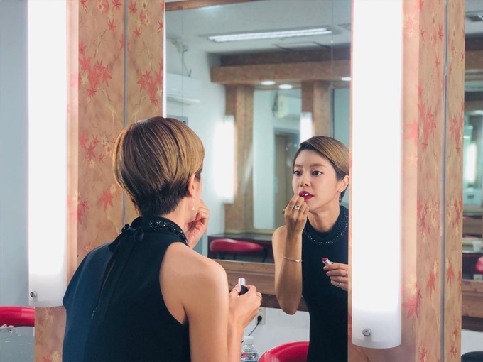 사진 속 이윤지는 거울을 보며 화장을 고치고 있다.