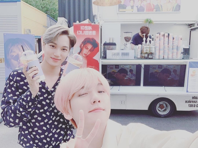 사진 속 백현(엑소)은 간식 차량 앞에서 사진 촬영을 하고 있다.