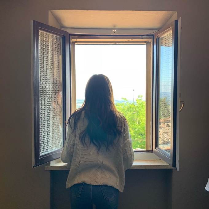 김유정은 자신의 인스타그램에 게재한 사진에서 창 밖을 바라보고 있다.