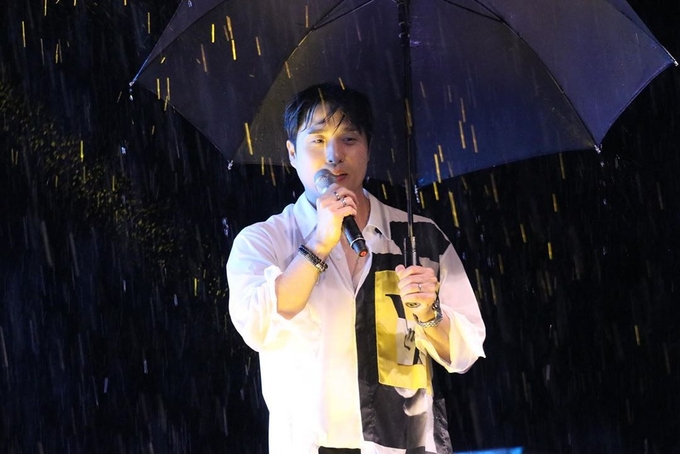 사진 속 이진성은 우산을 쓰고 공연을 하고 있다.