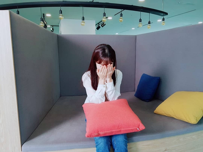 김슬기는 자신의 인스타그램에 게재한 사진에서 얼굴을 가리고 귀여운 매력을 뽐내고 있다.