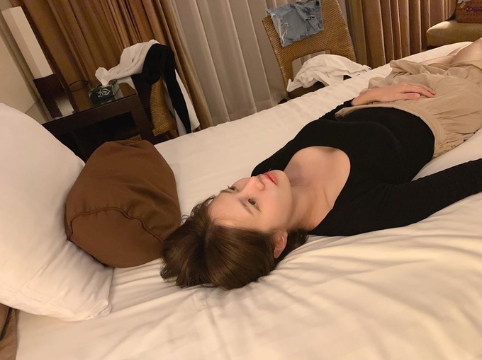최윤영은 자신의 인스타그램에 게재한 사진에서 편안하게 침대에 누워있다.