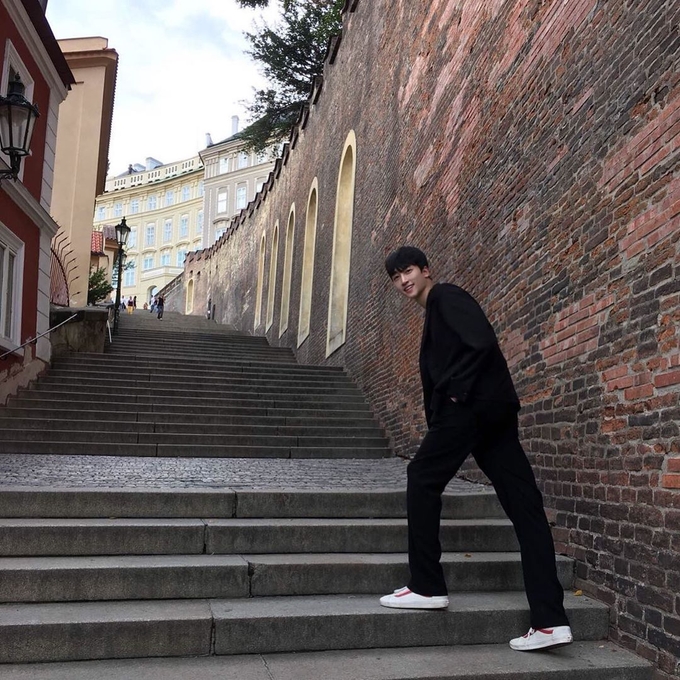 윤재정은 자신의 인스타그램에 게재한 사진에서 유럽여행당시를 회상하며 긴 기럭지를 뽐내고 있다.