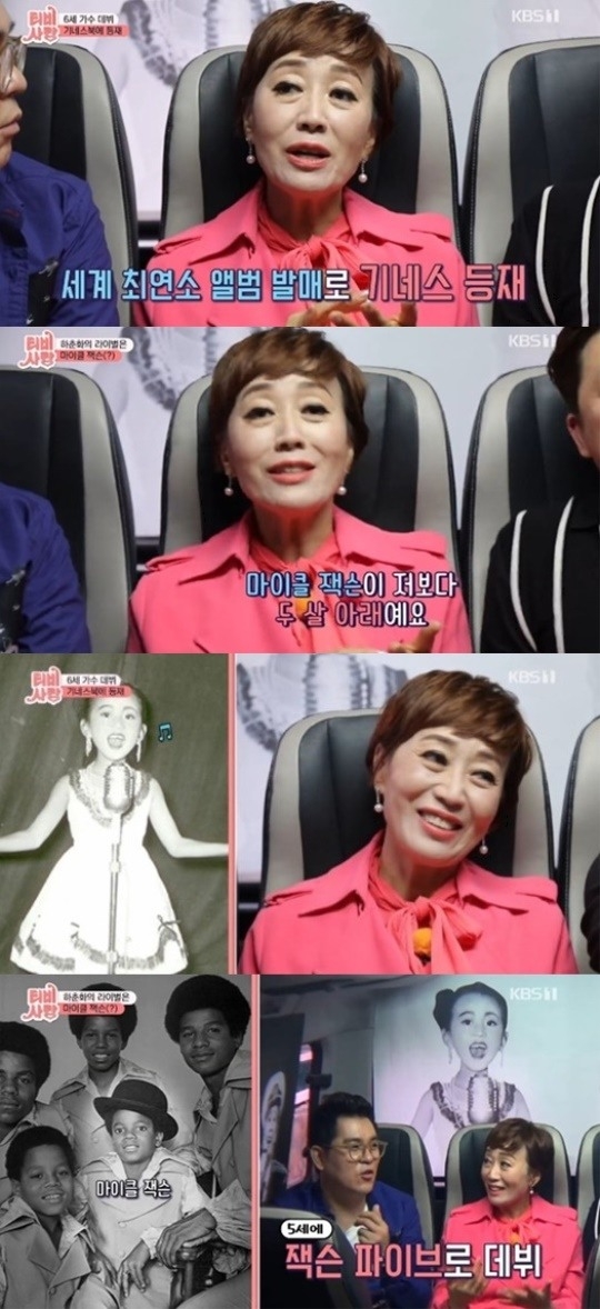 하춘화가 "그런데 기록은 후에 깨지라고 있는거다"며 "마이클 잭슨이 나보다 두살 아래인데 마이클 잭슨이 4살 때 내 기록을 깼다"고 밝혔다.