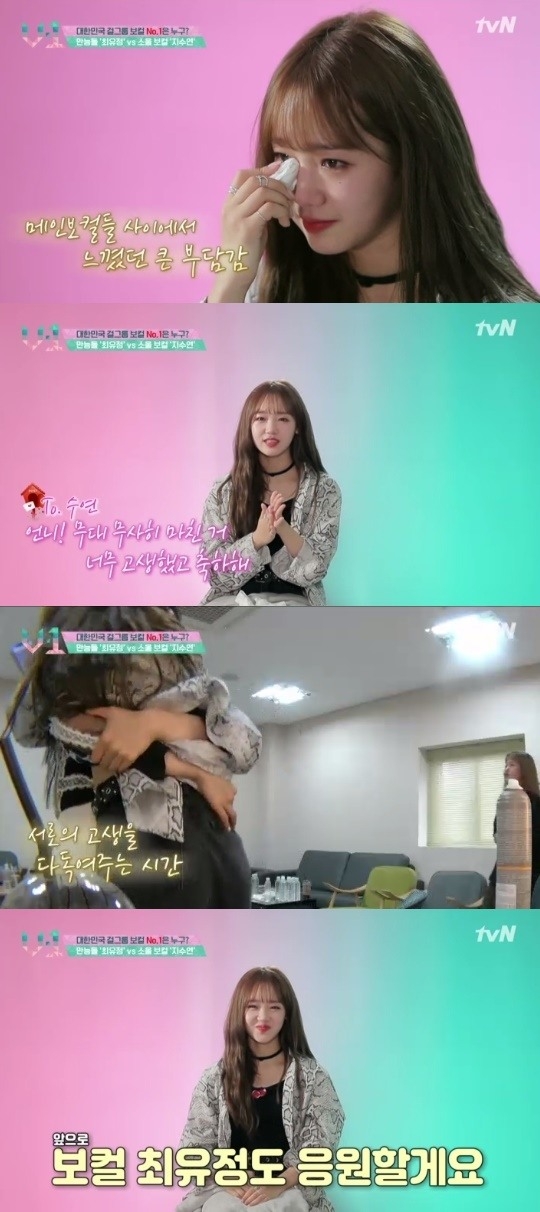 최유정은 "왜 눈물이 나지"라며 스스로 의아해하면서도 "너무 부담을 느껴서 그런 것 같다. 긴장이 풀렸다. 다들 보컬 위주로 하는 분들. 전 그런 게 아니라 부담이 컸다."며 그동안 느껴왔던 무게감을 한차례 내려놨다.