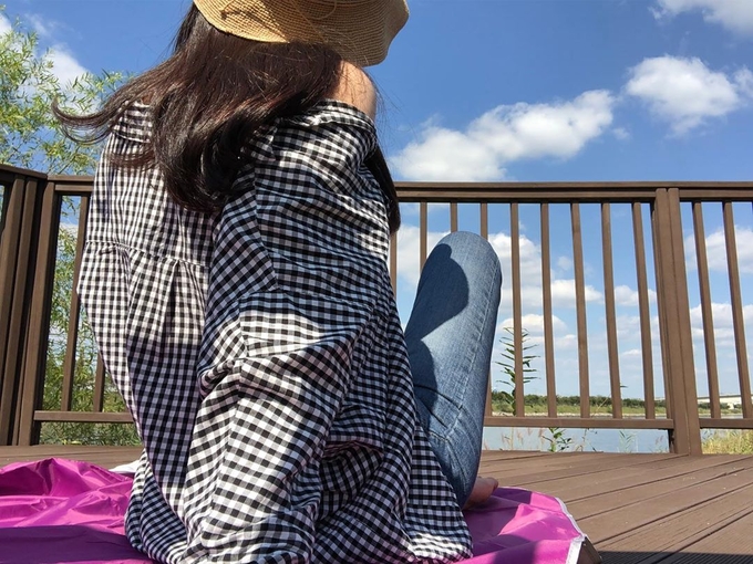 공개된 사진 속에는 이선영의 모습이 담겨 있는데, 맑은 하늘을 배경으로 사진 촬영을 하고 있다.