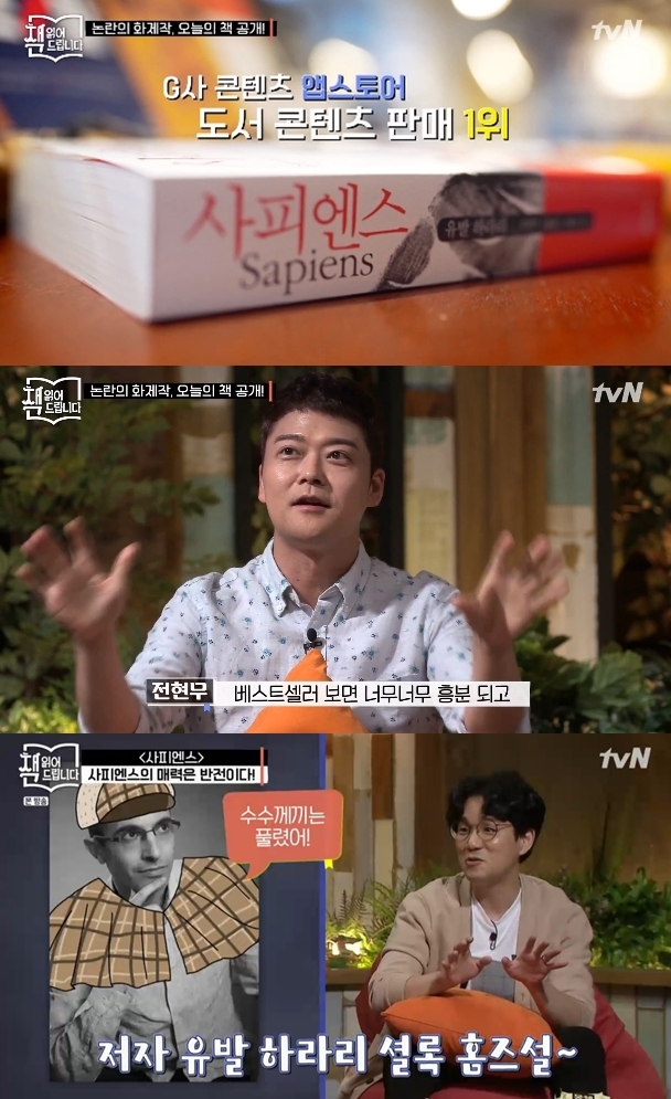 설민석은 책 '사피엔스'의 내용에 대해 간략하게 설명했고, 물리학 교수 김상욱과 작가 장강명은 간단하게 책에 대한 의견을 언급하며 이야기를 시작했다.