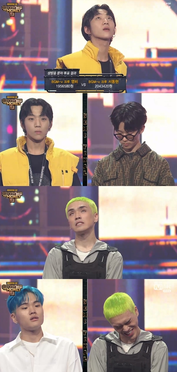 [농기자재신문=박혜린 기자] 27일 방송된 Mnet 서바이벌프로그램 '쇼미더머니8'에서는 BGM-v 크루 서동현, 영비, 펀치넬로와 40크루 타쿠와의 세미파이널과, 2인의 파이널 대결이 치러졌다.