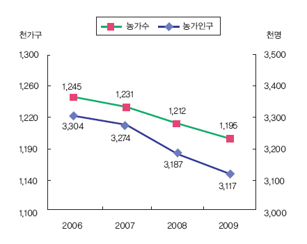통계청이 최근 발표한 ‘2009년 농업 및 어업조사’에 따르면 농가 수는 119만5000가구, 농가 인구는 311만7000명으로 전년대비 각각 1.4%와 2.2%가 감소했다. 농가비중은 총 가구 대비 7.1%로 전년에 비해 0.2% 감소했다. 농가의 급속한 고령화와 인구감소는 농가 경영주의 고령화로 이어져 농가 경영주 119만5000가구인 65%가 60세 이상을 차지하고 있다. 여성 경영주의 비중도 전체적으로 0.5% 증가해 21만9000가구에 달한다. 또 1인 가구의 비중이 14.9%인 17만8000가구, 2인 47.1%, 3인 16.7%로 전년 대비 각각 0.2%씩 증가한 반면 4, 5인 가구 비중은 줄어 핵가족이 늘어나고 있는 것으로 조사됐다. 연령대별 농가인구는 전반적으로 감소했으나 70세 이상 연령대에서는 3.6%가 증가했다. 이처럼 농가 인구의 고령화와 가족축소, 인구감소가 진행되는 것과 함께 2~3ha 사이, 5ha 이상을 경작하는 가구는 증가하고 3~5ha인 농가는 감소해 양극화가 심해지는 양상이다. 소득 측면에서는 판매금액 1000만원 미만인 농가는 65.8%인 78만6000가구로 0.9% 증가한 반면 5000만원 이상인 농가는 6만7000가구로 전년대비 9.1% 감소했다. 부농이 감소할 뿐만 아니라 빈농도 늘어 전반적으로 농가 경영이 어려워지고 있는 것으로 풀이된다. 전업농가는 전체농가의 58%를 차지하고 있으며 전업농가와 겸업농가를 비교해 볼 때 전업농가는 69만3000가구로 작년보다 2% 감소했다. 겸업농가 중에 농업수입이 농업외수입보다 큰 가구도 15만1000가구로 5.5% 감소했다. 반면 농업외수입이 농업수입보다 큰 겸업농가는 35만1000가구로 0.5% 상승해 농가에서도 농업외수입으로 살림을 꾸려가는 농가가 늘어나는 추세다. |