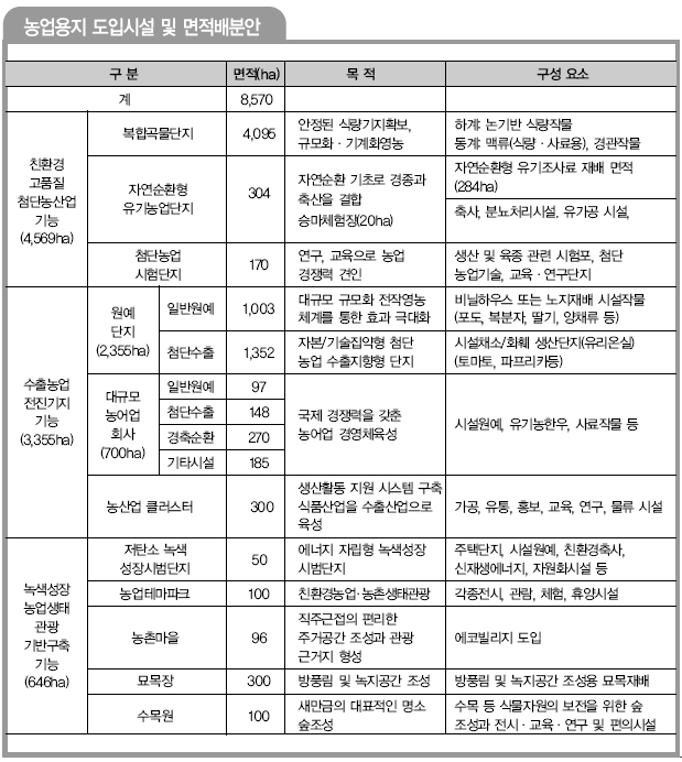 | 정부는 새만금 방조제 준공을 계기로 본격적인 내부 개발에 나서 새만금을 ‘동북아 경제중심도시’로 변모시킨다는 구상이다. 2020년까지 1단계, 2021년 이후를 2단계로 나눠 추진하되 1단계에서 전체 면적의 71.4%를 개발할 예정이다. 특히 다기능 부지 명소화 사업, 농업용지 구간 방수제 축조, 명품 복합도시 건설, 매립토 조달 사업, 만경·동진강 하천 종합정비 사업 등 5대 선도사업을 중점적으로 추진키로 했다. 또 관광, 산업, 농업단지를 조성하는 2단계 내부개발 사업을 통해 새만금은 세계적인 복합 명품도시로 만든다는 계획이다. 정부가 지난 1월 발표한 ‘새만금 내부개발 기본구상 및 종합 실천계획’에 따라 앞으로 새만금은 농업용지, 산업용지, 관광용지, 생태·환경용지, 과학·연구용지, 신재생에너지용지, 도시용지 등 8개 용지로 구분해 개발할 계획이다. 농식품부, 특구지정 ‘미래형 선진농업단지’로 육성 새만금 농지(8570㏊)는 ‘미래형 선진농업단지’로 탈바꿈된다. 농식품부는 법률 제·개정을 통해 새만금을 국내 최대 ‘농식품산업특구’로 지정해 전체 농지의 30%(2600㏊)를 원예단지로 조성하고 이중 1500㏊는 자본과 기술이 집약된 수출전용 첨단유리온실단지로 조성한다는 계획이다. 여기엔 농식품 가공산업단지와 물류지원단지(1101㏊)도 포함됐다. 또 경종과 축산을 결합한 자연순환형 축산단지(574㏊), 농업과 생태관광을 접목한 관광농업단지(200㏊), 식량안보와 기계화 영농을 고려한 복합곡물단지(3790㏊), 유전자 이용기술을 활용해 신품종을 개발하고 보급할 채종단지(305㏊)도 들어선다. 첨단농업시험단지(170㏊)와 농산업클러스터(300㏊), 저탄소녹색성장 시범단지(50㏊) 등 지원시설도 포함됐다. 특히 전북도는 지난달 14일 농식품 수출전진기지 육성과 관련 한국농어촌공사와 농산무역, 동부그린바이오, (주)초록마을 등 대규모 농업회사와 사업협약을 체결하고 2011년부터 기반 조성에 나서기로 했다. 농산무역은 250ha(약75만 평)의 유리온실과 노지에서 파프리카와 완두콩 등을 재배해 수출할 계획이다. 동부그린바이오도 종자와 비료 등 농자재업체로 333.3ha(약100만 평)에 한우의 사료로 사용되는 보리와 유기농 쌀 등을, 친환경농산물 전문 유통업체인 초록마을은 116.7ha(약35만 평)에 한우 사육과 유기농 채소 등을 재배할 예정이다. 새만금 대규모농어업 회사단지는 오는 6월 농업용지 기본계획을 수립 한 후 하반기에나 대규모 농어업회사 단지 세부설계에 착수해 이르면 2011년 초 도로와 전기·용배수로 등 기반공사를 착공할 계획이다. |