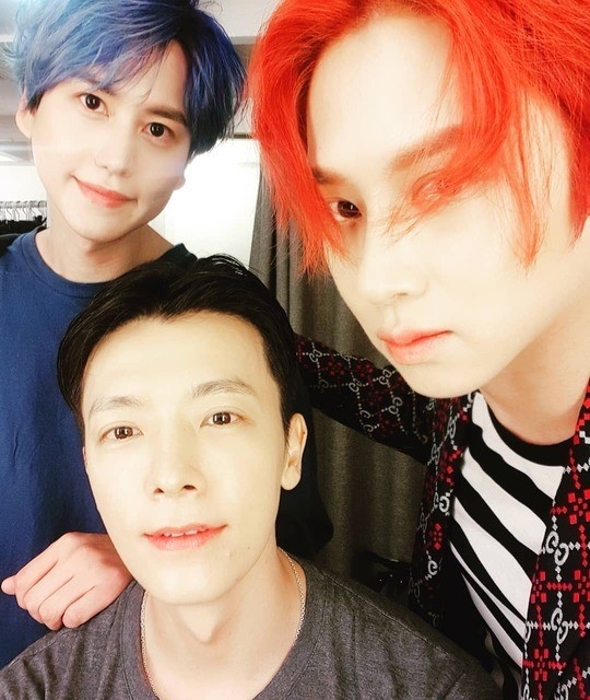 옆에 선 규현은 파란색 머리를 동해는 검은색 머리를 했다.