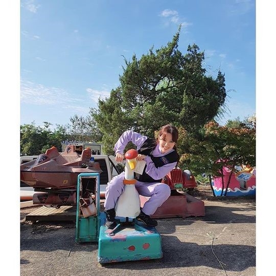 사진 속에는 오리 모형 위에 올라타 해맑게 웃고 있는 나혜미 모습이 담겼다.