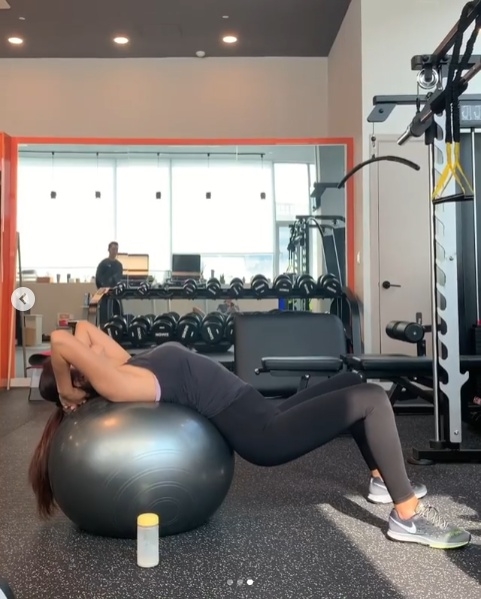 공개된 사진 속 김빈우는 짐볼 등 각종 운동 기구를 이용해 운동을 하고 있는 모습이다.