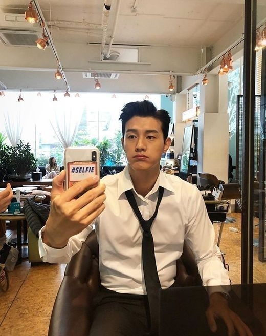 공개된 사진 속 이기우는 와이셔츠에 타이를 맨 채 셀카를 찍고 있다.