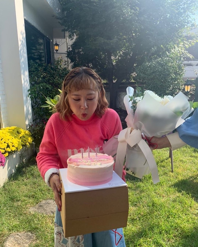 공개된 사진 속 박나래는 생일 케이크를 들고 촛불을 끄고 있는 모습이다.