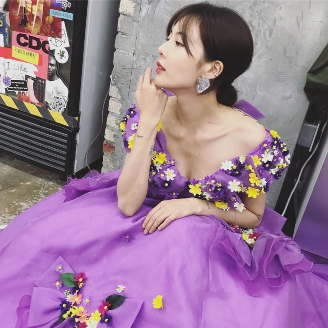 공개된 사진 속 현아는 화려한 꽃장식이 된 보라색 드레스를 입고 포즈를 취하고 있는 모습이다.