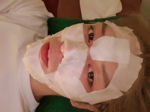 사진 속 김재중은 누워서 피부 관리를 받고 있다.