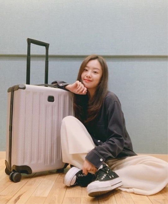공개된 사진 속 송지은은 편안한 복장으로 캐리어에 기대어 미소를 짓고 있는 모습이다.