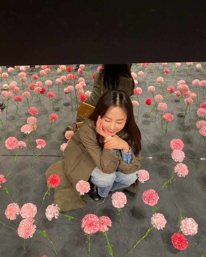 소희는 자신의 인스타그램에 게재한 사진에서 아름다운 모습으로 꽃 옆에 앉아 있다.