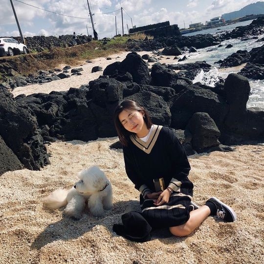 사진 속 권소현은 해변가에서 반려견과 앉아 있는 모습이다.