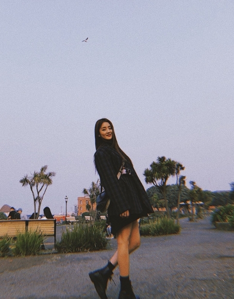 공개된 사진 속 민니는 야외에서 해맑게 웃으며 포즈를 취하였다.