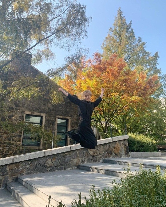 공개된 사진 속 이태리는 올블랙 패션으로 계단에서 높이 점프를 하였다.