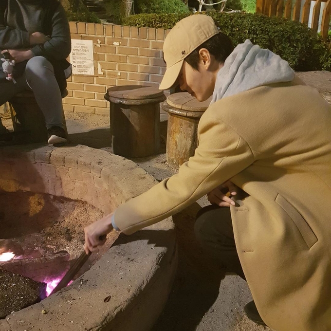 김관수는 자신의 인스타그램에 게재한 사진에서 모자를 쓰고 군고구마를 굽고 있는 모습이 포착됐다.